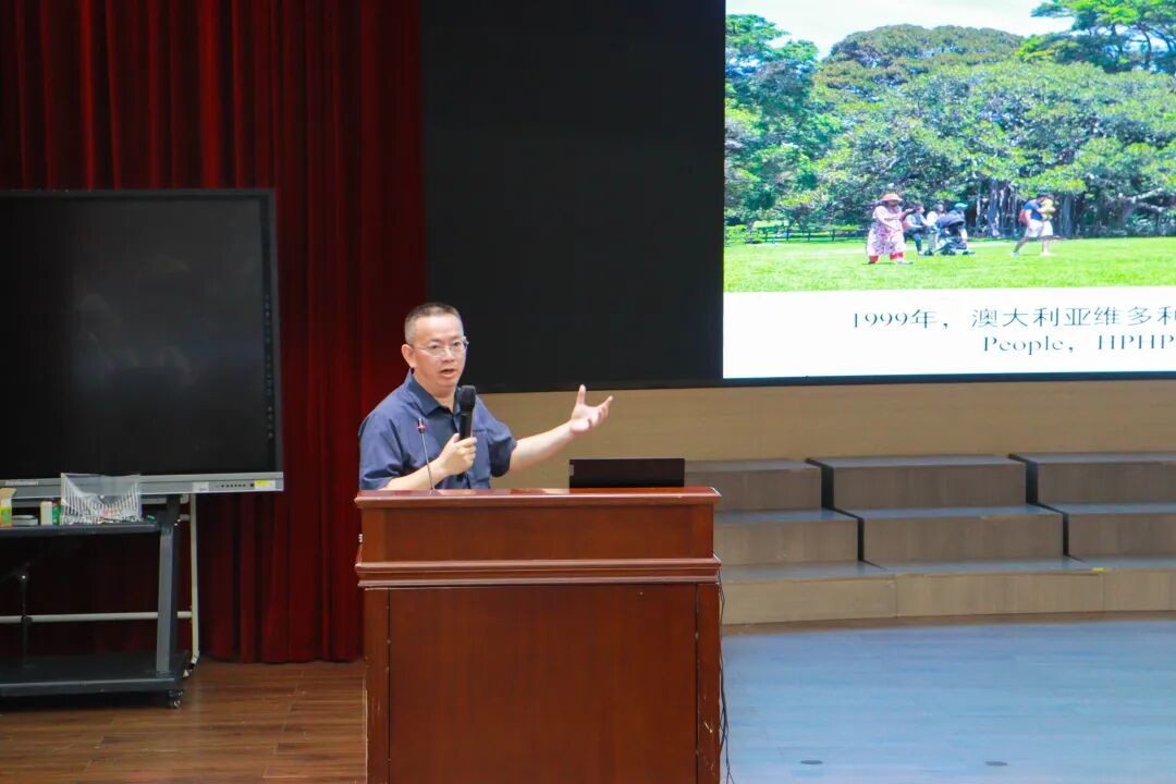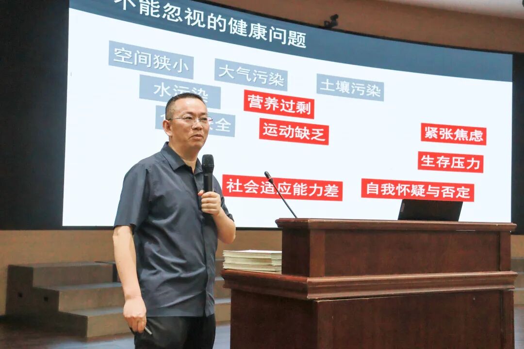 他结合PPT展示,点出了现代生活中容易被忽视的“健康杀手”:空气污染让人呼吸不畅,久坐不动让身体“生锈”,学习压力、家庭关系紧张、甚至“自然缺失”——孩子们待在室内的时间太长,缺少在自然中奔跑、观察、放松的机会,这些都悄悄影响着大家的身心健康。