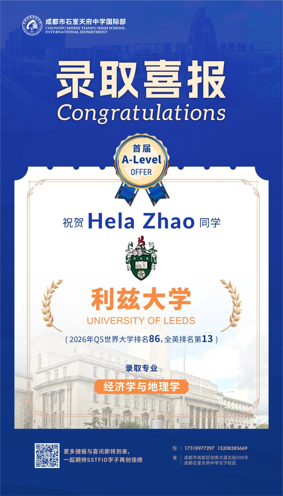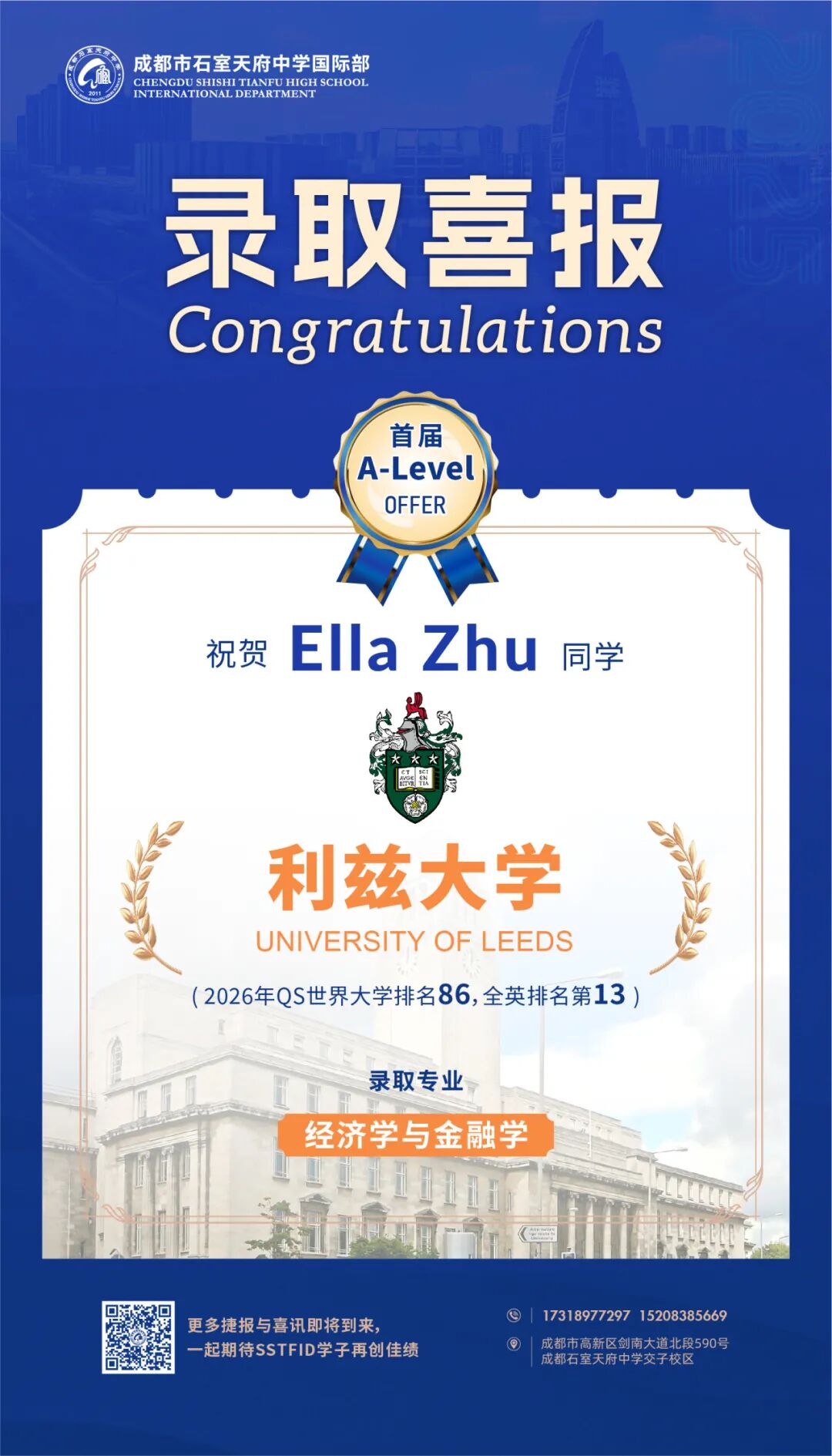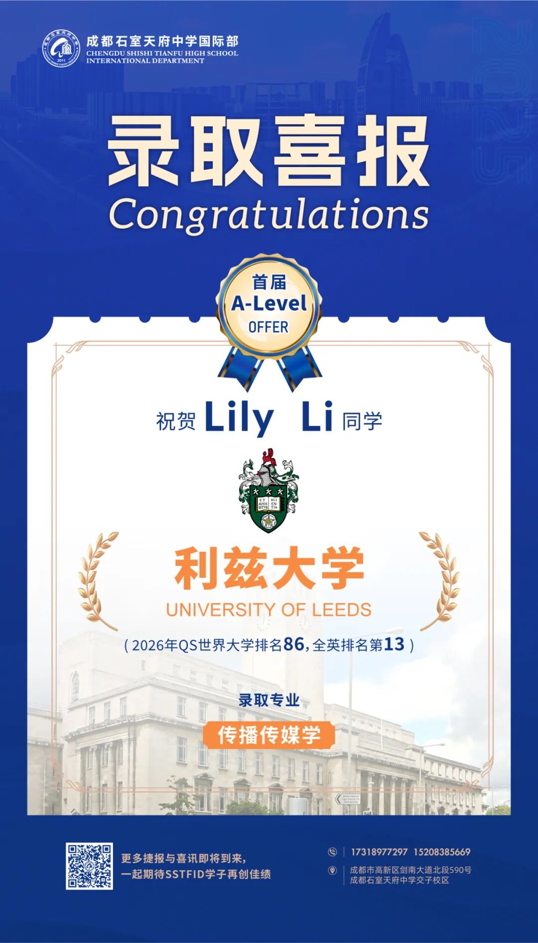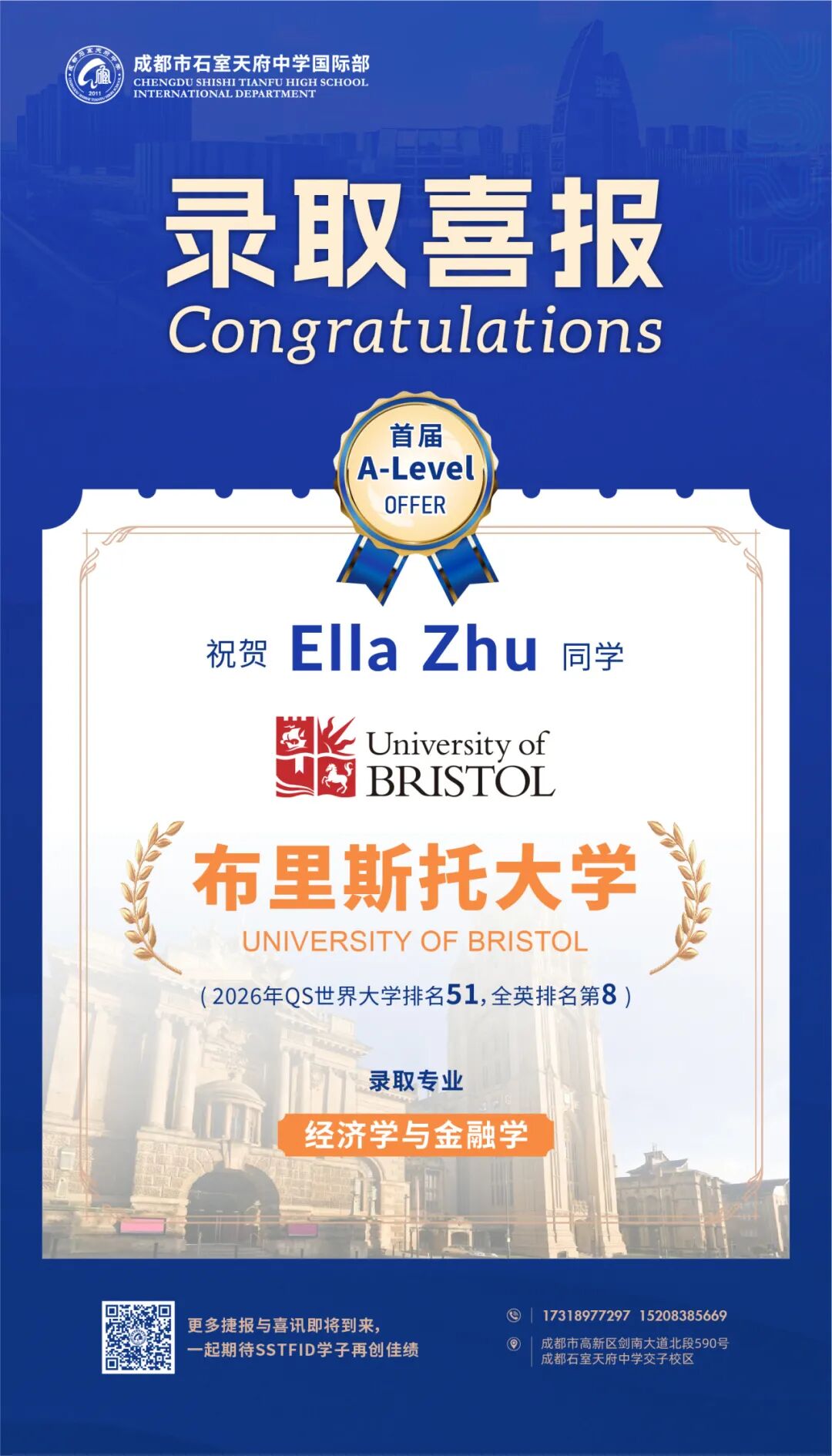 石室天府国际部首届A-Level学子海外大学录取已拉开帷幕,录取喜讯接踵而至。继第一波曼大和南安普顿大学录取喜讯之后,近日,被称为“牛剑之外的第一选择”的布里斯托大学也为同学们递来了橄榄枝,利兹大学也收获了3枚offer。