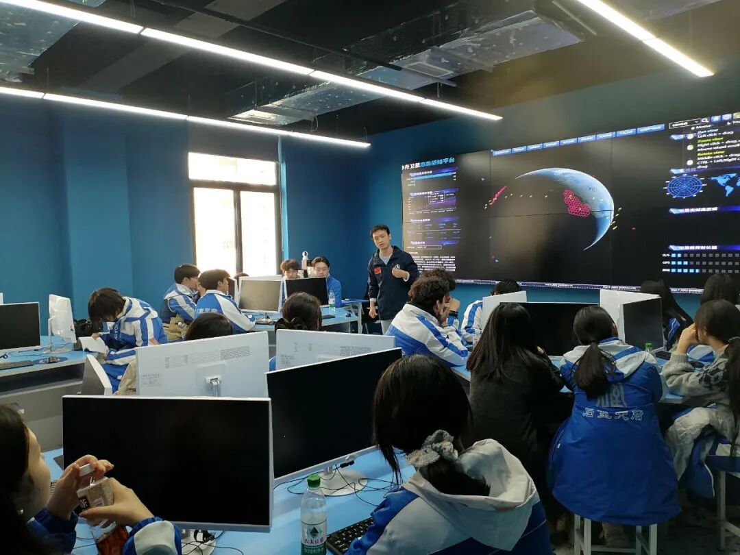 卫星测控与AR体验:在专业的卫星测控站,同学们学习了卫星测控的组成部分与基本流程,并从职业角度深入探讨航天知识。在AR观影空间,他们更是“亲临”浩瀚宇宙,观察卫星运行,体验了一场沉浸式的太空漫游。