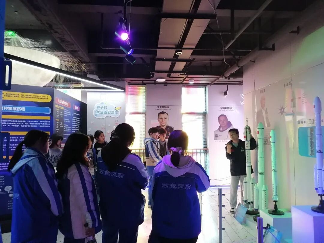 航天展馆漫游:从火箭发射到空间站,从月表探索到太空种植园,同学们穿梭于航天历史长廊,通过丰富的展区和实物(如火箭残骸),全面了解了我国航天事业的发展脉络与伟大成就。
