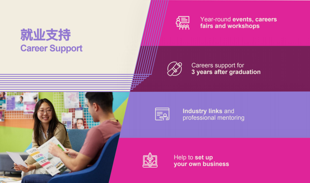 大学的就业支持系统贯穿学业全程与毕业后三年:包括职业展会、行业工作坊、一对一专业指导等。毕业生薪资亦表现亮眼,以经济学本科为例,毕业15个月后平均年薪达36,500英镑,五年后可增长至57,500英镑。