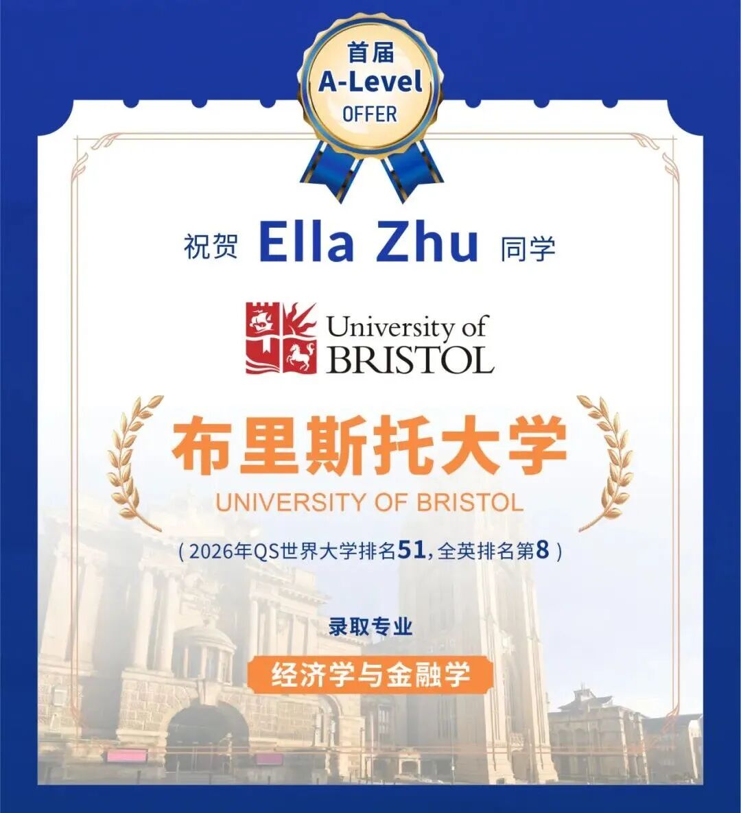2025年11月,石室天府国际部的Ella Zhu同学便凭借优异的学术表现,成功获得了布里斯托大学经济学与金融学专业的录取。这一案例生动地印证:对于目标明确、扎实准备的A-Level学子而言,通往这所世界顶尖学府的道路清晰可见。